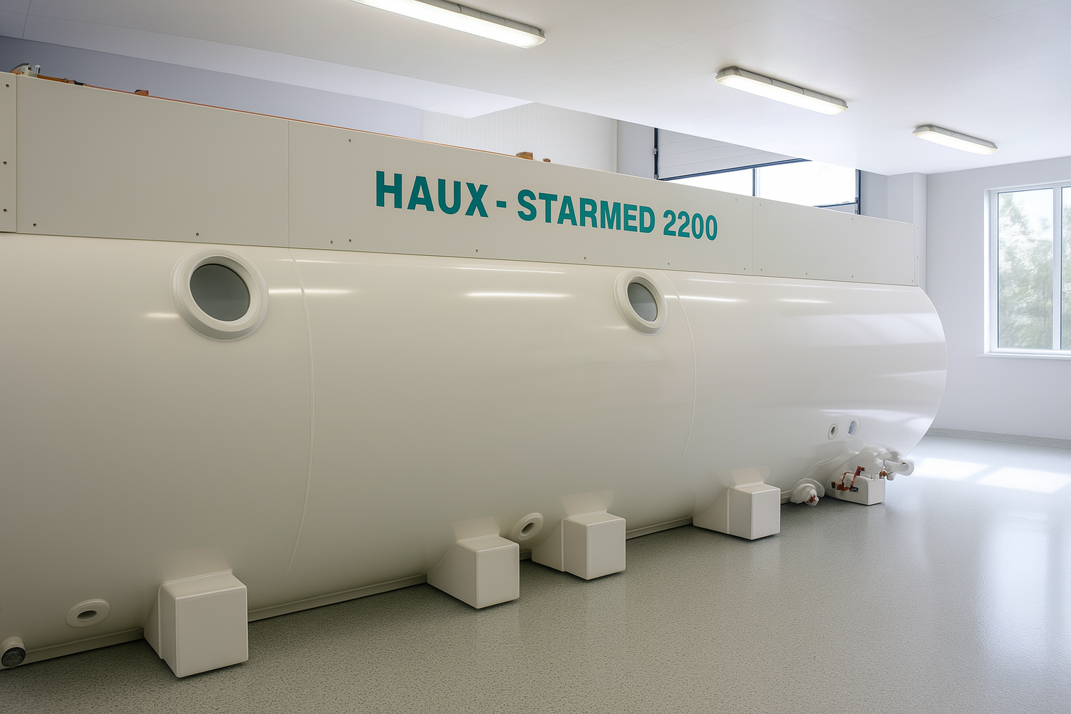 Haux-Starmed multiplace chamber, med en diameter av 2,2 meter, vilket gör att patienter med klaustrofobi kan lugnt få sin behandling utan någon obehagskänsla. Den är rymlig med bekväma fåtöljer och har plats för upp till 12 personer vid varje session. Kammaren består av två separata delar, huvudkammare och luftsluss. Kammaren är utrustad med ett modernt syrgas-andningssystem med mycket lågt andningsmotstånd. Kammaren är vidare utrustad med modernt övervakningssystem, med dels en datoriserad enhet som noga övervakar tryck etc, samt en TV-monitorering av kammarens insida och ett högeffektivt brandsläckningssystem.